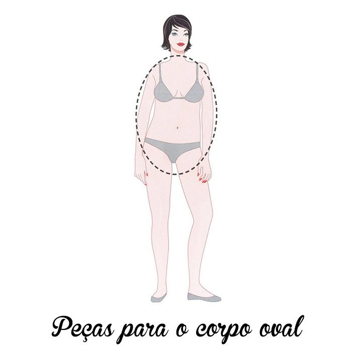 O corpo oval apresenta uma curvatura ovalada entre o busto e a cintura. Está normalmente associado a pessoas acima do peso, com peso aparente na região central (a famosa barriguinha!). Ao escolher um biquíni, prefira peças que tirem atenção do abdômen, destacando outras partes do seu corpo.