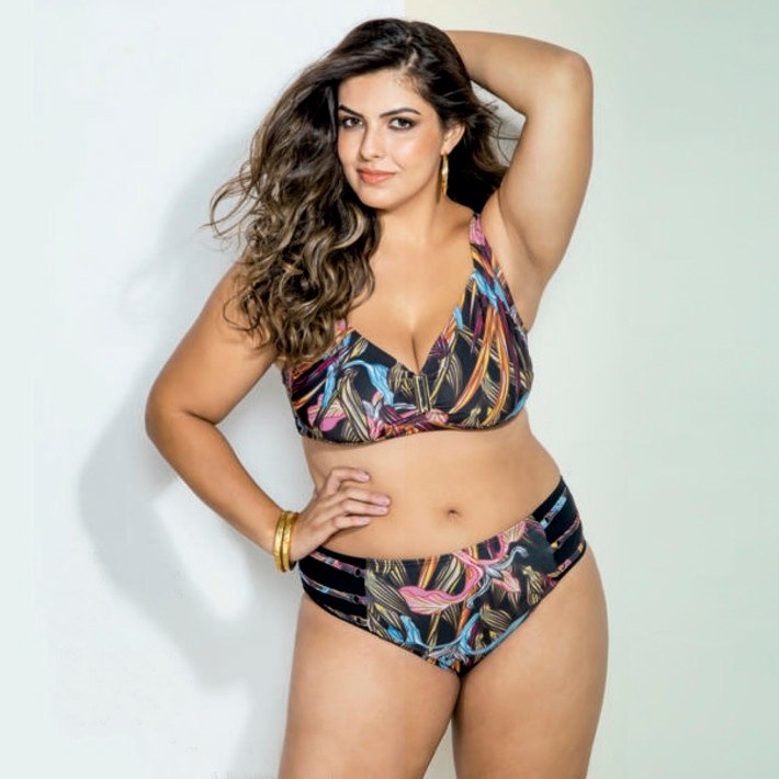 Por isso, procure peças de cores mais chamativas, estampadas ou texturizadas, lacinhos laterais, babados etc. Na parte de cima, alças mais grossas costumam ajudar no volume e a calcinha asa delta pode alongar ainda mais a silhueta, aumentando também a definição da cinturinha.